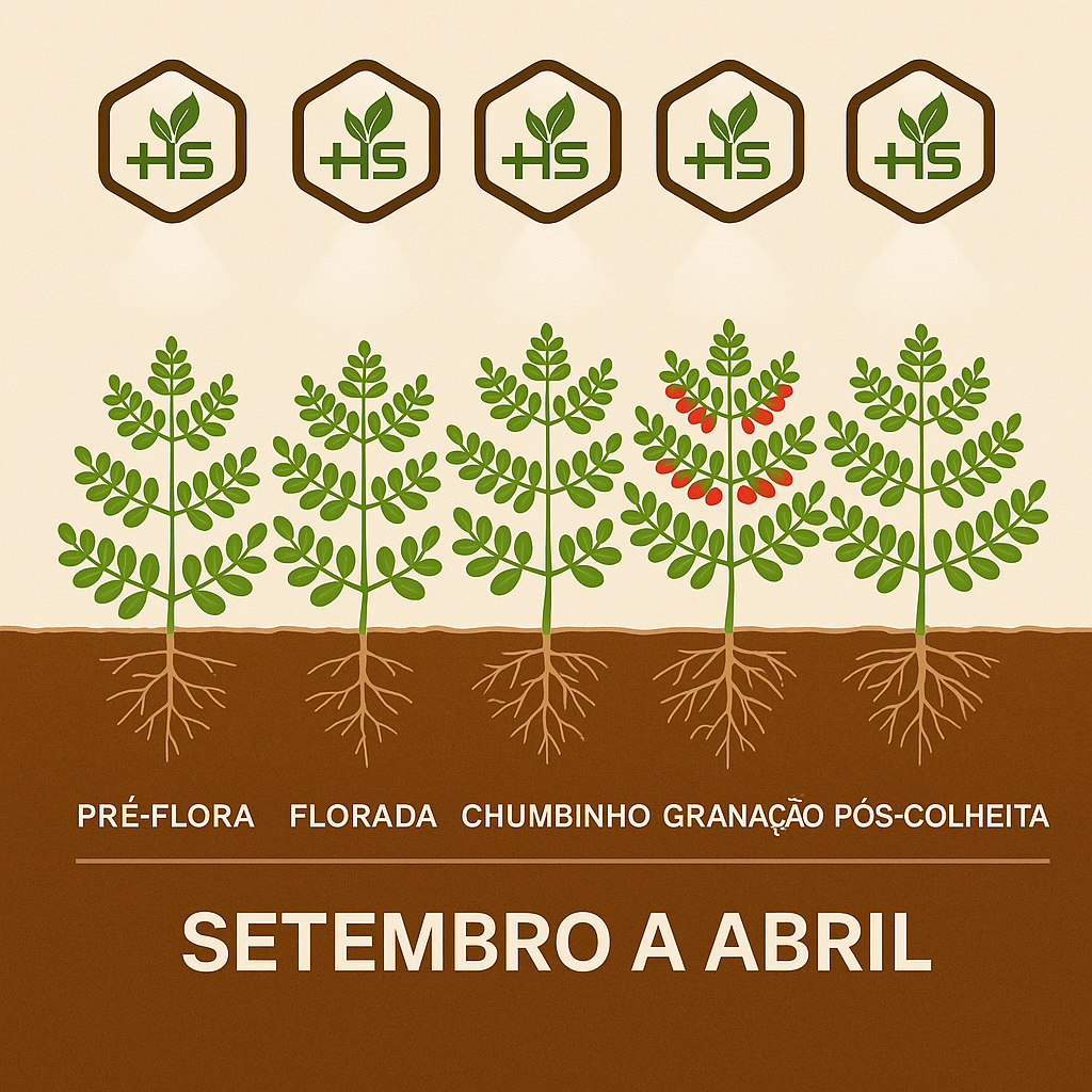 O HS é aplicado via foliar, de forma simples e eficiente, acompanhando as fases de maior demanda da sua planta.