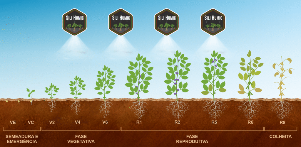 Conheça o SiliHumic, a solução inovadora que utiliza tecnologia de nanopartículas com Silício, Magnésio e Substâncias Húmicas para proteger a soja dos estresses do clima!