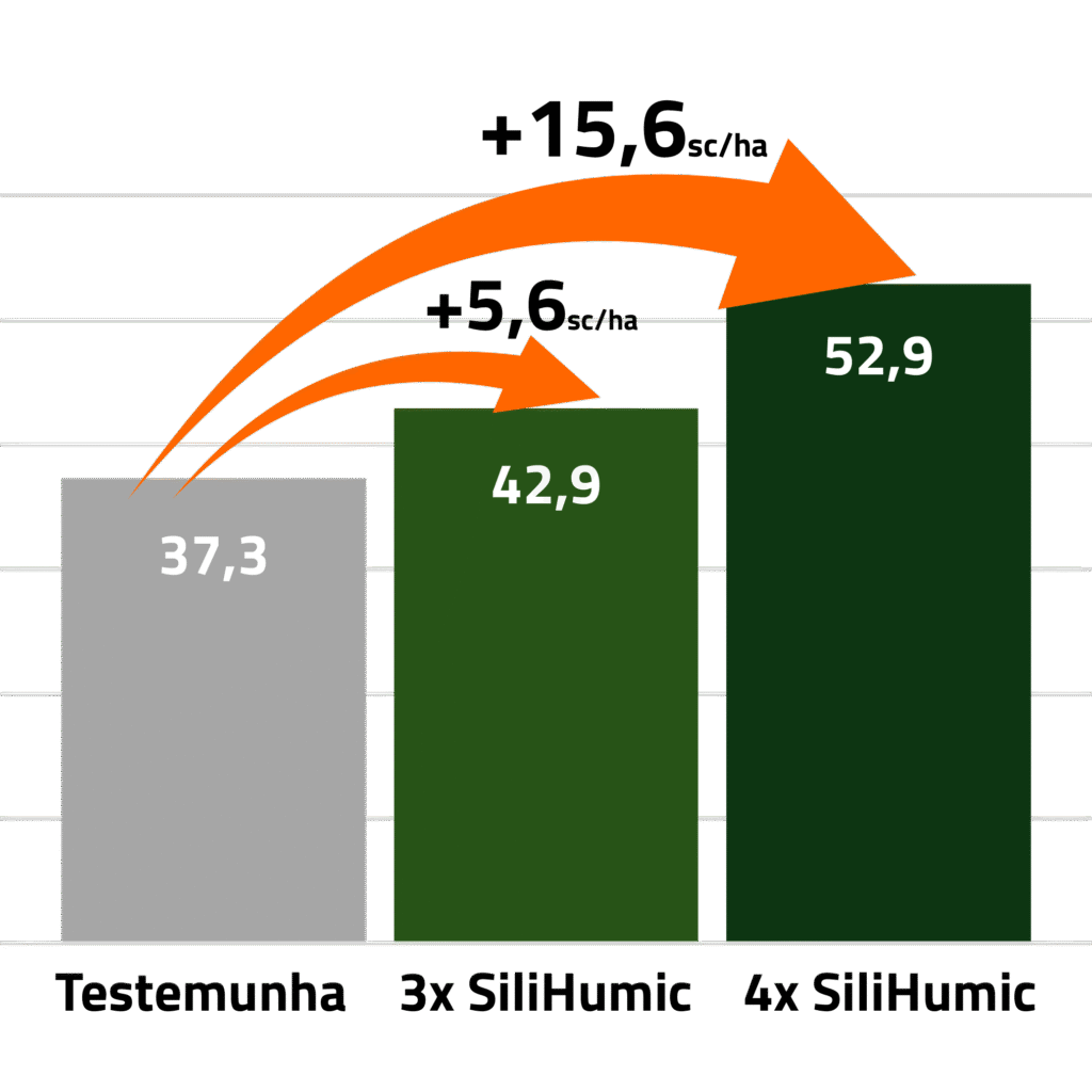 Trabalho realizado na UNESP mostrou um incremento de 5,3 sc/ha na produtividade com aplicação de SiliHumic. É lucro real na sua safra!